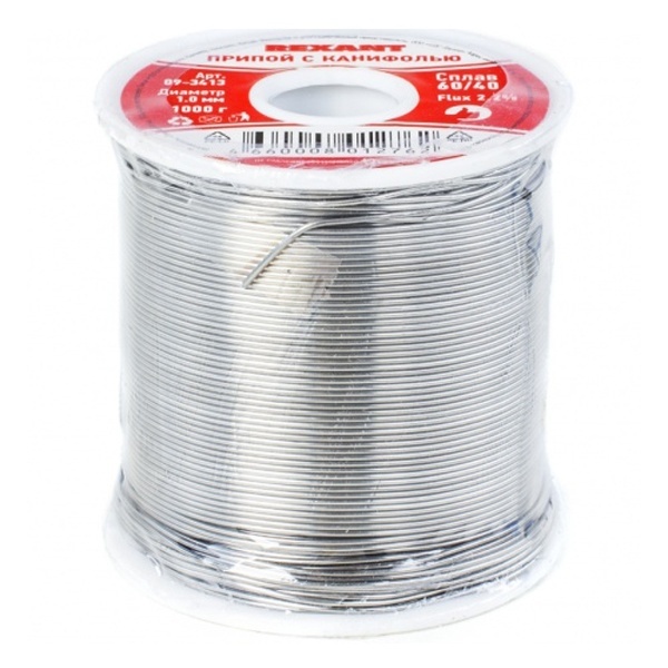 Припой с канифолью REXANT представляет собой проволоку (диаметром 1 мм) из сплава олова (60 %) и свинца (40 %). Используется в пайке для соединения деталей между собой и позволяет создать герметичный, механически прочный (устойчивый) шов. Нагреваясь до температуры плавления (183...188 °C) припой: расплавляется, смачивает спаиваемый металл и, растекаясь по нему - заполняет место между соединяемыми деталями.В свою очередь флюс канифольный активный (MC-20A) помогает сделать паянное соединение более прочным! Убирая окислительную плёнку со спаиваемых поверхностей и защищая их от дальнейшего окисления при пайке. Содержание флюса в припое - 2,2 %.Как видно из вышесказанного припой с канифолью REXANT - самое что ни на есть «два в одном»:припой и флюс на катушках по 1000 грамм!