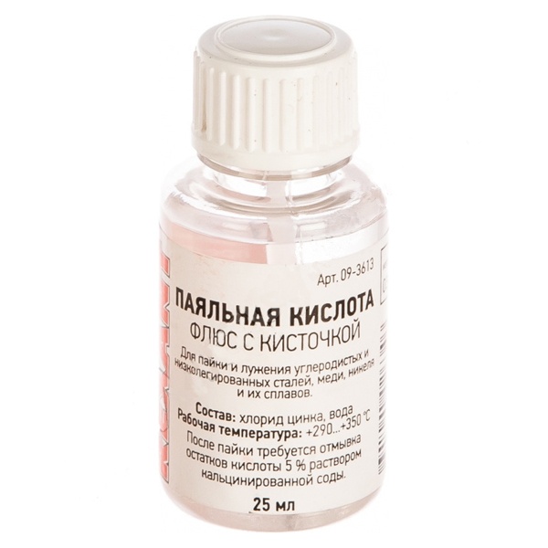 Флюс для пайки паяльная кислота 25мл (с кисточкой) REXANT предназначен для удаления оксидов с поверхности под пайку, улучшения растекания жидкого припоя при пайке углеродистых и низколегированных сталей, меди, никеля и их сплавов. Это одно из самых распространенных средств для пайки. Данный низкотемпературный флюс применяется при пайке деталей или поверхностей припоями оловянно-свинцовой группы в температурном диапазоне 290-350?. После пайки требуется отмывка остатков кислоты 5% раствором кальцинированной соды. Крышка-кисточка позволит наносить дозированное количество флюса на участки пайки.