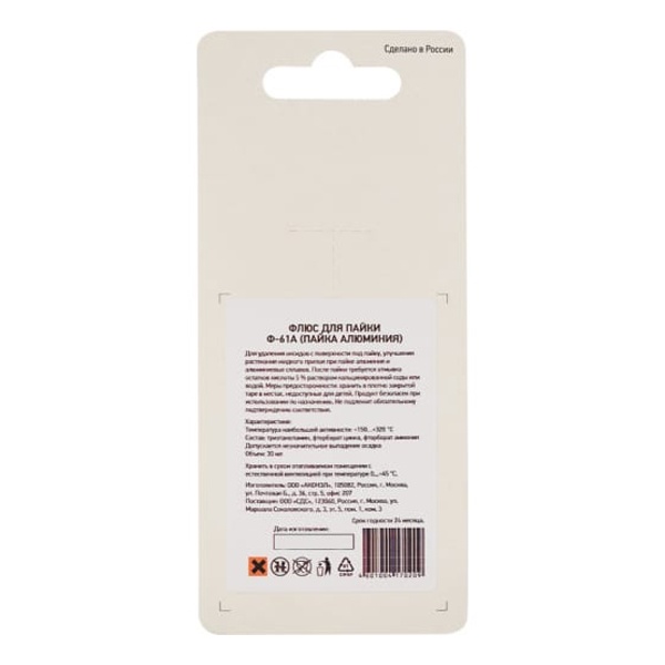 Флюс для пайки Ф-61А (пайка алюминия) 30 мл REXANT предназначен для удаления оксидов с поверхности под пайку, улучшения растекания жидкого припоя при пайке алюминия и алюминиевых сплавов. Изготовлен на основе фторборатов, что значительно выделяет его из всей группы соединений для пайки.Данный низкотемпературный флюс применяется при пайке деталей или поверхностей припоями оловянно-свинцовой группы в температурном диапазоне 150...320 °C. После пайки остатки соединения убирают водой или смоченной в спирте салфеткой.