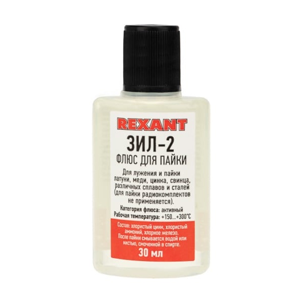 Флюс для пайки ЗИЛ-2 30 мл REXANT предназначен для удаления оксидов с поверхности под пайку, улучшения растекания жидкого припоя при пайке меди и ее сплавов. Преимущественно ранее использовался для пайки латунных радиаторов автомобилей ЗИЛ.В современных условиях применяется в различных областях, в том числе при монтаже и ремонтных работах систем кондиционирования. Флюс ЗИЛ-2 относится к категории активных.Для пайки применимы припои оловянно-свинцовой группы, цинковые, кадмиевые, висмутовые.Температура эффективной активности флюса находится в диапазоне 150...300 °C. После пайки смывается водой или кистью смоченной в спирте.