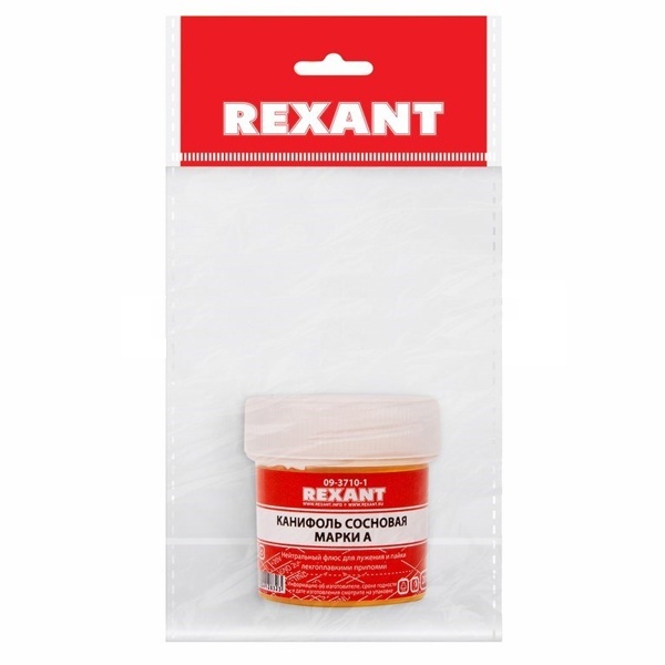 Канифоль сосновая марки А 20 г REXANT предназначена для удаления тонких и нестойких оксидов с поверхности под пайку, улучшения растекания жидкого припоя при пайке печатных плат и радиокомпонентов.Канифоль - хрупкое, стекловидное вещество темно-красного или светло-желтого цвета, применяется в качестве нейтрального флюса при пайке и лужении деталей или поверхностей припоями оловянно-свинцовой группы. Она входит в состав смол хвойных деревьев и получается из живицы.