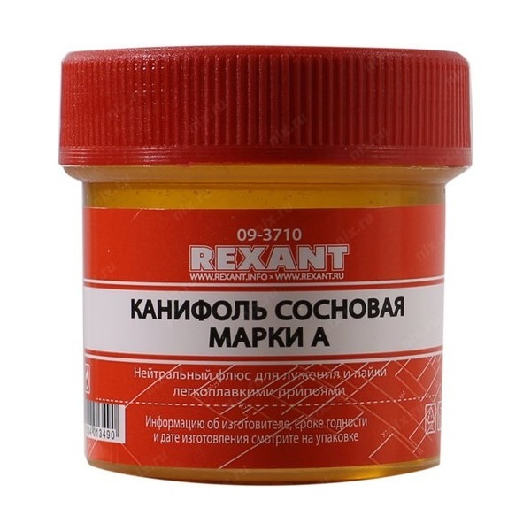 Канифоль сосновая марки А 20 г REXANT предназначена для удаления тонких и нестойких оксидов с поверхности под пайку, улучшения растекания жидкого припоя при пайке печатных плат и радиокомпонентов.