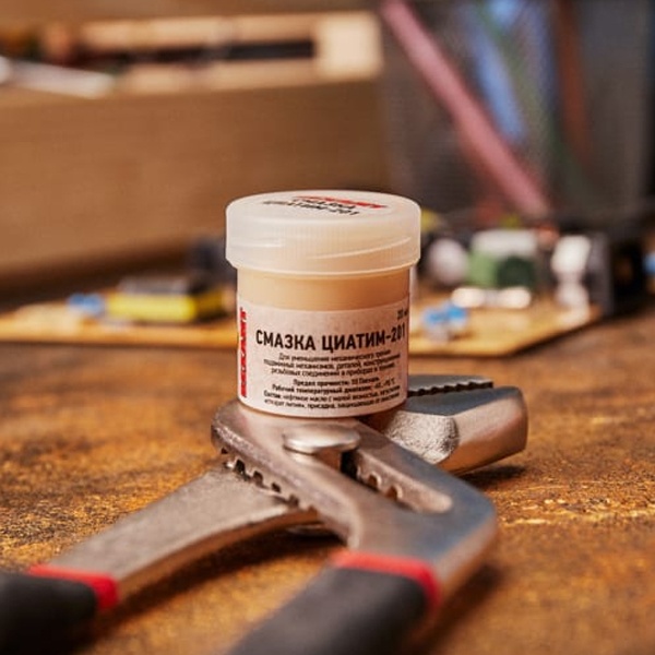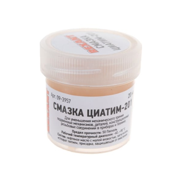 Смазка ЦИАТИМ-201 20 мл REXANT — антифрикционная многоцелевая смазка, предназначенная для смазывания узлов трения, скольжения и качения в механизмах авиационной (наиболее широкая сфера применения), автомобильной и другой наземной техники, радиотехнического оборудования, электромеханических и точных приборах, работающих с минимальным сопротивлением при низких температурах. А также является наиболее удобной в плане обработки трущихся частей и механизмов охотничьих ружей: стволов, замков, скользящих поверхностей, ударно-спусковых механизмов.Смазка ЦИАТИМ (Центральный Институт Авиационного Топлива и Масел) имеет маловязкую консистенцию и применяется в достаточно широком температурном диапазоне –60...+90 °C, что обеспечит её эксплуатацию в условиях Крайнего Севера.Она представляет собой маловязкое нефтяное масло светло-коричневого или светло-желтого цвета, обладающая морозостойкими и тугоплавкими свойствами.