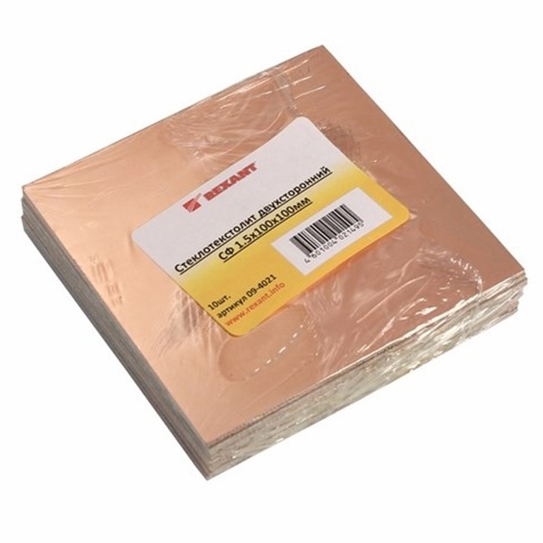 Стеклотекстолит односторонний СФ1.5-1-0.35 100х100мм REXANT предназначен для использования в электро- и радиотехнике, для механического и электрического соединения различных электронных компонентов. Представляет собой композицию стеклоткани и связующего материала на основе эпоксидных смол, а также с одной стороны покрытый медной, электролитической, гальваностойкой фольгой. Листовой текстолит служит основой для изготовления печатных плат. Благодаря своему составу из стеклоткани он отличается высокой механической прочностью при сжатии и высокой ударной вязкостью. Лист текстолита хорошо поддается любой механической обработке: резание, сверление и т.д. Эксплуатация изделия, в качестве электроизоляционного материала, должна быть в условиях нормальной относительной влажности атмосферы и при частоте тока 50Гц. Особенность изделий из стеклотекстолита - небольшой вес.