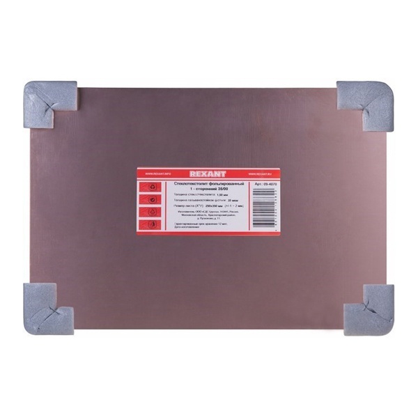 Стеклотекстолит 1-сторонний 250x350x1.5 мм 35/00 (35 мкм) REXANT представляет собой композицию стеклоткани и связующего материала на основе эпоксидных смол, а также с одной стороны покрытый медной электролитической гальваностойкой фольгой толщиной 35 мкм.Листовой текстолит служит основой для изготовления печатных плат высокого качества. Отличные физические и химические характеристики сделали этот материал самым востребованным.