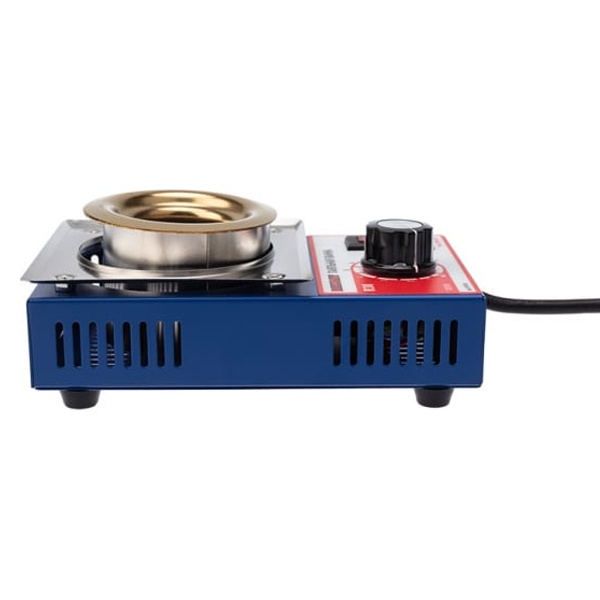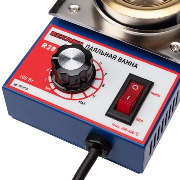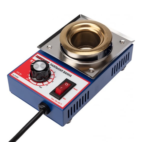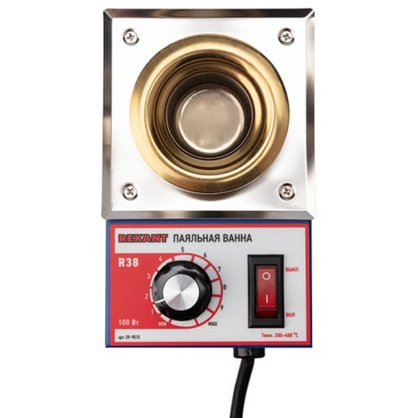 Небольшая настольная паяльная ванна компании Rexant модель R38 применяется для лужения проводников, кабельных наконечников в расплавленном припое. Устройство отличается улучшенным управлением температурой, при котором температурный сигнал отсылается на микропроцессор. После обработки сигнал регулирует степень нагрева нагревательного элемента для точности температурного контроля. Паяльная ванна обеспечивает нагрев в температурном диапазоне от 200 до 480 градусов Цельсия, нужная температура достигается за короткое время. Мощность прибора составляет 100 Ватт, он работает в сети с напряжением 230 Вольт и частотой 50 Герц. Ванна изготовлена из антикоррозионной нержавеющей стали. Диаметр тигеля – 38 мм, время плавления – 30 минут, вместимость припоя – 300 грамм. Паяльная ванна очень проста в использовании, удобна для работы, как в условиях непрерывного производства, так и для использования в небольших мастерских по ремонту теле- и радиоаппаратуры. В комплект поставки входит основной блок и паспорт изделия.