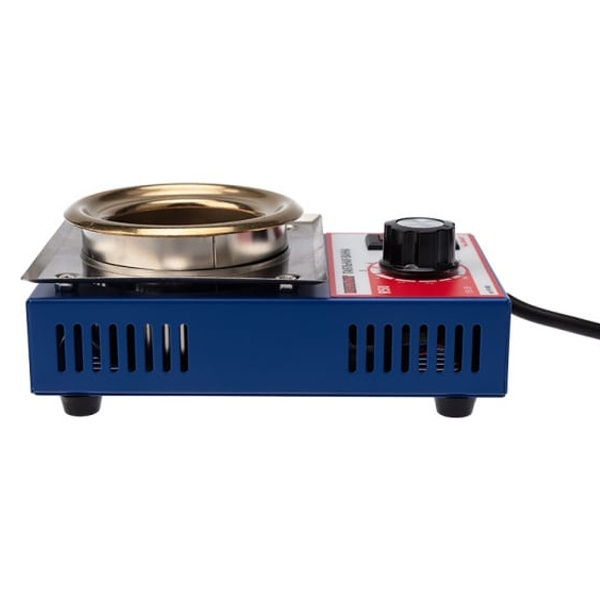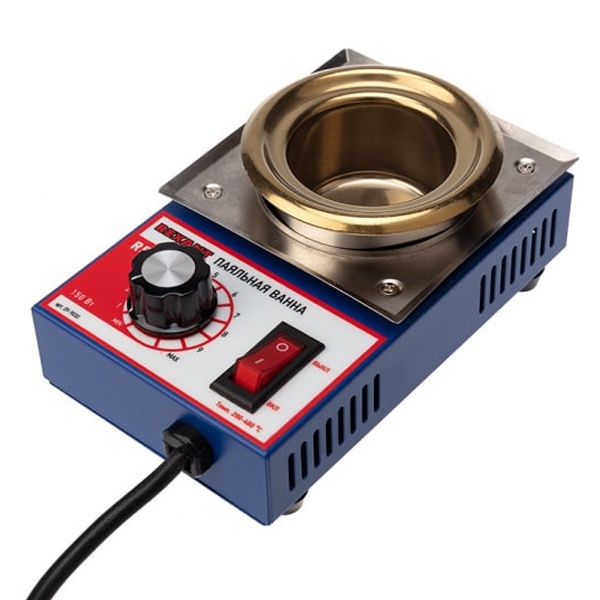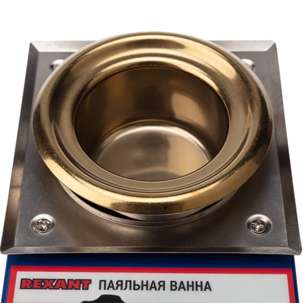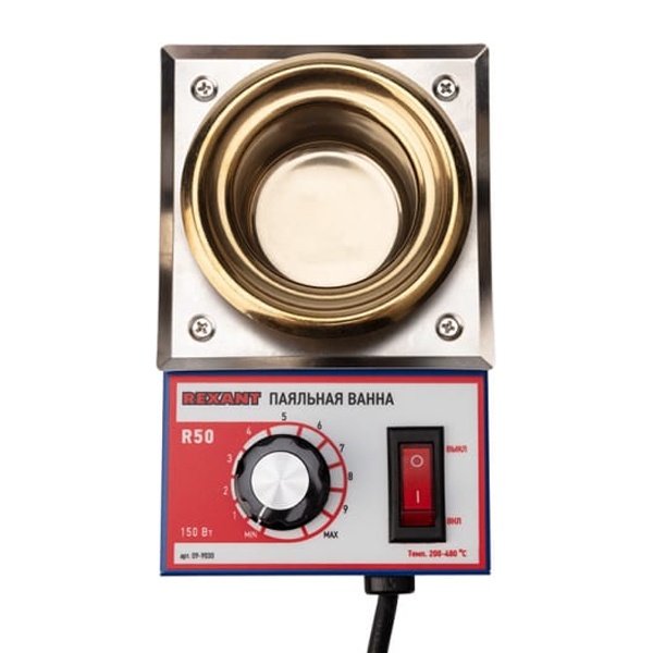 Паяльная ванна производителя Rexant модель R50 применяется для лужения проводников, для плавки припоя и пайки малогабаритных радиоэлектронных компонентов методом погружения в припой. Она поддерживает заданный температурный режим длительное время для осуществления качественных паяльных работ. Температурный сигнал отсылается на микропроцессор и регулирует степень нагрева нагревательного элемента. Диапазон рабочих температур прибора составляет 200-480 градусов Цельсия. Нужная температура достигается за короткий промежуток времени. Время плавления – 30 минут. Паяльная ванна имеет мощность 150 Ватт. Она работает от бытовой сети с напряжением 230 Вольт и частотой 50 Герц. Ванна имеет круглую форму, она изготовлена из антикоррозийной нержавеющей стали. Ее диаметр равен 50 мм, вместимость припоя составляет 500 грамм. Устройство простое в использовании. Не сложно менять части и производить ремонт. В комплект входит основной блок для пайки и инструкция по эксплуатации.