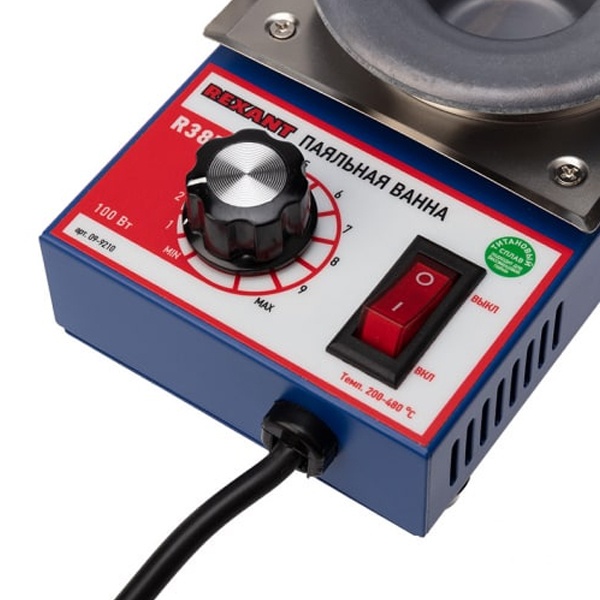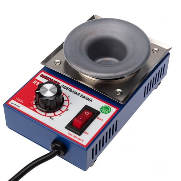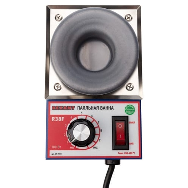 Настольная паяльная ванна фирмы Rexant модель R38F предназначена для плавки припоя, лужения кабельных наконечников и пайки малогабаритных радиоэлектронных компонентов методом погружения в припой. Эта модель поддерживает бессвинцовую технологию. Благодаря управлению температурой с помощью микропроцессора обеспечивается точный температурный контроль степени нагрева нагревательного элемента. Диапазон рабочей температуры устройства составляет от 200 до 480 градусов Цельсия, нужная температура достигается за короткое время. Мощность прибора – 100 Ватт, он работает в сети с напряжением 230 Вольт и частотой 50 Герц. Ванна изготовлена из антикоррозийной нержавеющей стали. Диаметр тигеля – 38 мм. Тип припоя – бессвинцовый, вместимость припоя – 300 грамм. Время плавления – 30 минут. Паяльная ванна компактна, проста в использовании, она удобна для работы, как в условиях непрерывного производства, так и для использования в небольших мастерских по ремонту теле- и радиоаппаратуры. В комплект поставки входит основной блок и паспорт изделия.