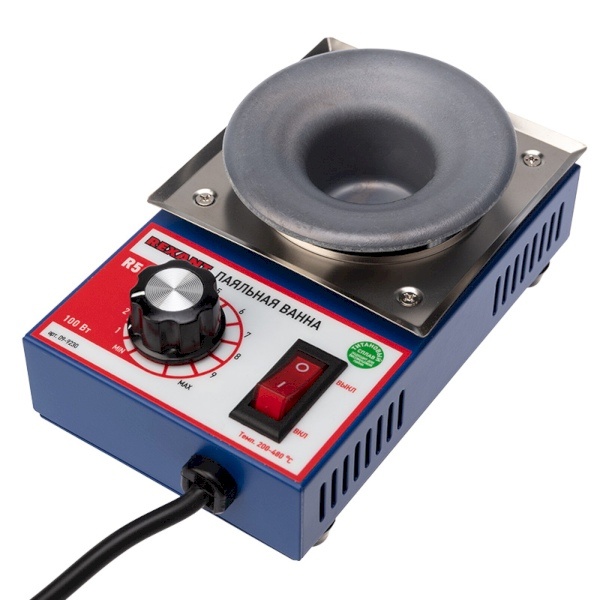 Бессвинцовая паяльная ванна с микропроцессорным управлением компании Rexant модель R50F применяется для лужения проводников, кабельных наконечников в расплавленном припое. Устройство оснащено нагревателем с повышенной долговечностью и высокоточной системой поддержания заданной температуры, при котором температурный сигнал отсылается на микропроцессор. После обработки сигнал регулирует степень нагрева нагревательного элемента для точного температурного контроля. Паяльная ванна обеспечивает нагрев в температурном диапазоне от 200 до 480 градусов Цельсия, нужная температура достигается за короткое время. Тигель имеет диаметр 50 мм, глубину 40 мм и выполнен из нержавеющей стали. Напряжение питания паяльной ванны – 230 Вольт, частота 50 Герц, мощность изделия – 150 Ватт. Для этой модели ванны применяется бессвинцовый припой, вместимость припоя составляет 500 грамм. Время плавления – 30 мин. В комплект поставки входит основной блок и паспорт изделия.