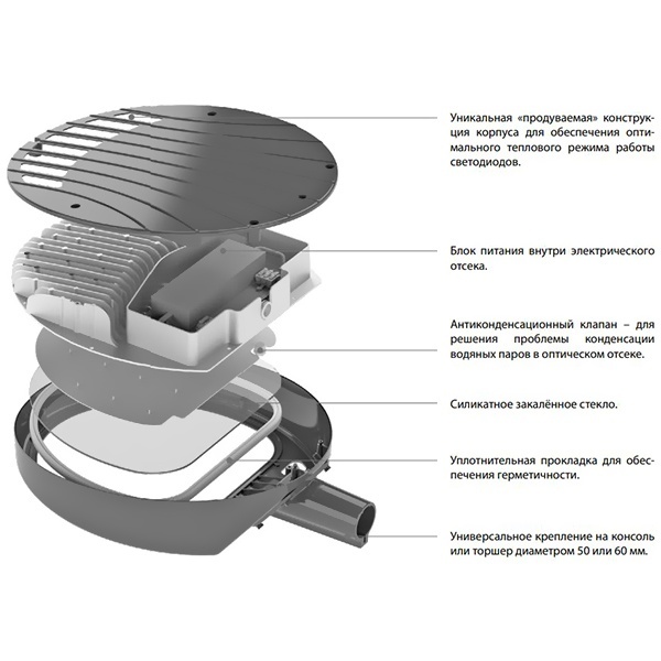 Особенности:- Уникальная продуваемая конструкция корпуса для обеспечения оптимального теплового режима работы светодиодов