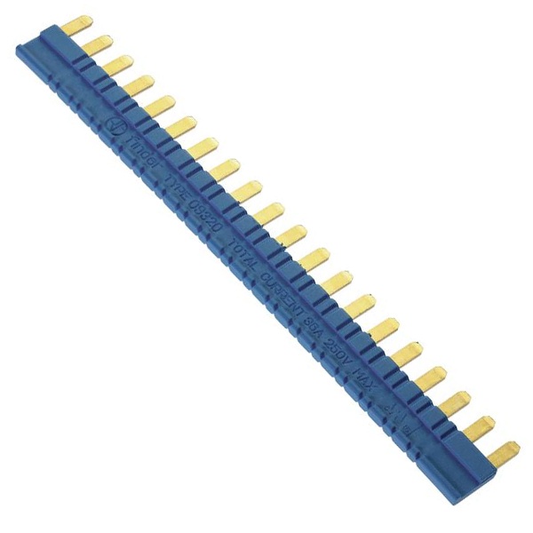 Данная модель шинного соединителя представляет собой принадлежность торговой марки Finder для серии реле 38.21/51/61/81/91. С ее помощью осуществляется объединение питания одного полюса реле. Внешне аксессуар представляет собой пластину синего цвета с 20-ю полюсами с шагом 6,2 мм, заключенными в изолятор. Материалом токопроводящих частей служит латунь с защитным гальваническим покрытием, а материалом изоляции корпуса является устойчивый к ультрафиолету самозатухающий полиамид. Данная модель рассчитана на номинальный рабочий ток 36 Ампер при напряжении сети 250 Bольт.