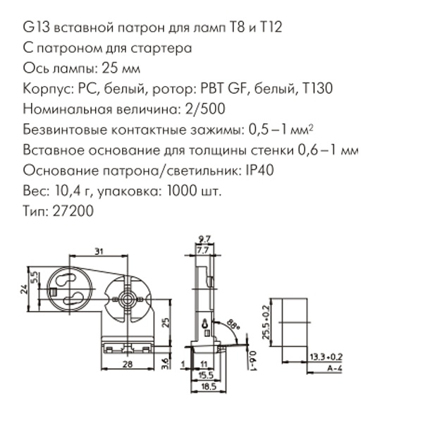 Патрон для люминесцентных ламп T8 и Т12 вставной с патроном для стартера 100536