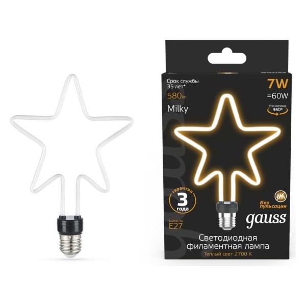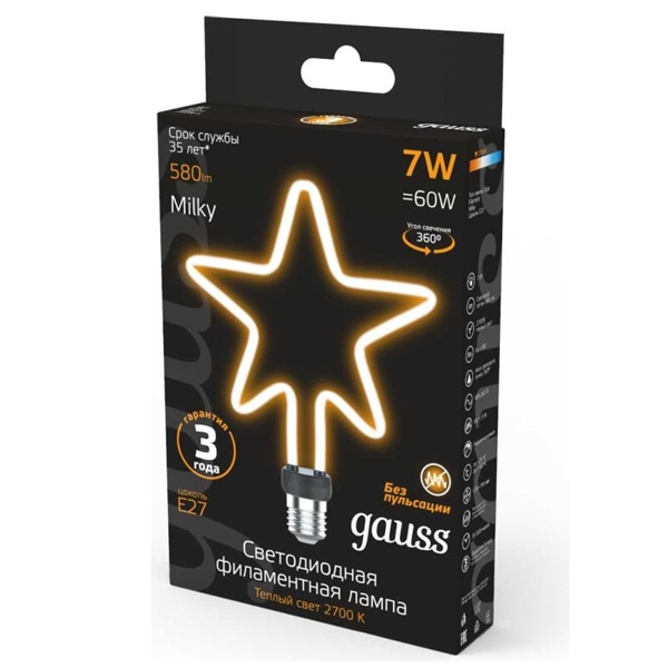 Филаментная, декоративная лампочка Гаусс в форме пятиконечной звезды, мощностью 7 Ватт с цоколем E27, теплый свет, матовая 1006802104