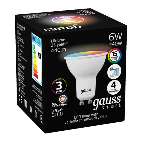 Диммируемая светодиодная лампочка Гаусс, мощностью 6 Ватт, с цоколем GU10, 15 оттенков цветности, 5 шагов диммирования 101106406