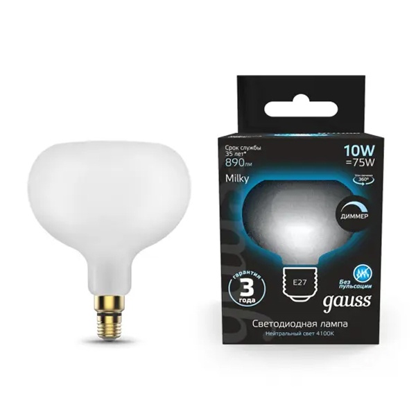Лампа филаментная светодиодная Gauss А190 10W 4100K E27 890Lm молочный диммируемая 1017802210-D