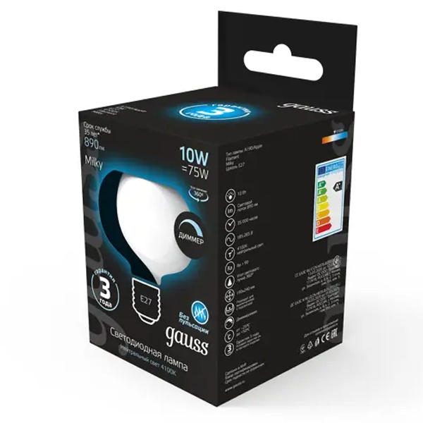 • Лампа филаментная светодиодная Gauss А190 10W 4100K E27 890Lm молочный диммируемая