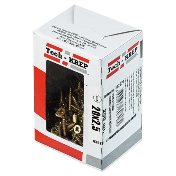 Универсальный саморез Tech-KREP 2,5х20 предназначен для надежного крепежа в бытовых и профессиональных монтажных работах. Метиз выполнен со стойким покрытием желтый цинк, которое помогает защитить крепеж от коррозии при эксплуатации в стандартных условиях (внутри помещений и в сухих зонах). Потайная головка обеспечивает аккуратную установку заподлицо с поверхностью, что особенно удобно при сборке изделий из древесины и креплении листовых материалов.