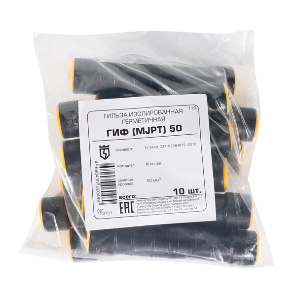 Гильза КВТ изолированная герметичная ГИФ (MJPT) предназначена для надежного соединения фазных магистральных проводов СИП. Обеспечивает прочное электрическое соединение с защитой от влаги и внешних воздействий благодаря герметичной изоляции. Идеально подходит для использования в наружных и внутренних электрических сетях, обеспечивая долговечность и безопасность соединений.