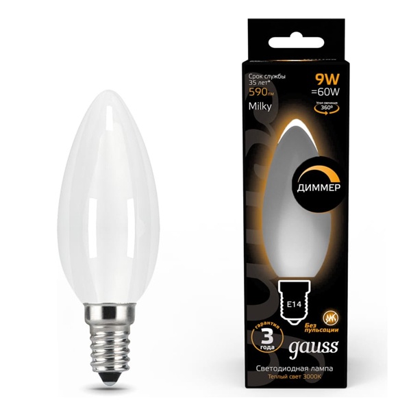 Филаментная, диммируемая лампочка формы свеча с нитевидными светодиодами, мощностью 9 Ватт, с цоколем E14 (миньон), теплый белый свет, матовая колба 103201109-D