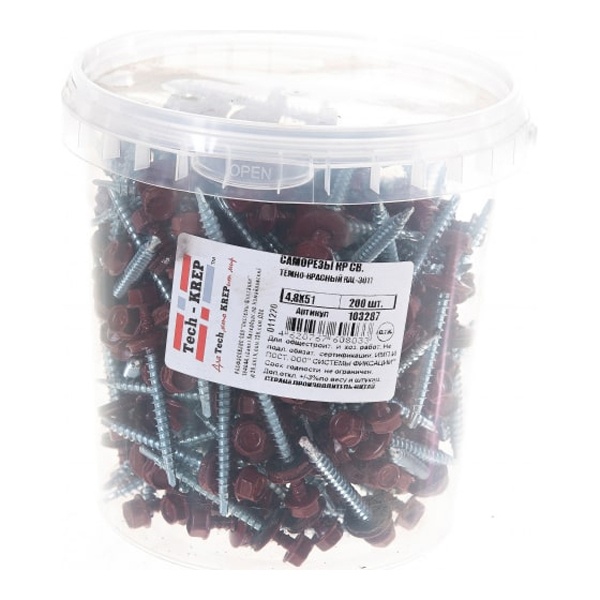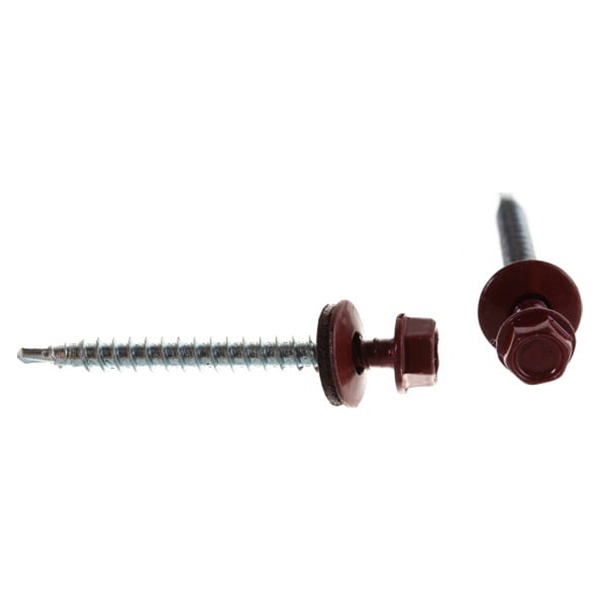 Саморез кровельный окрашенный тёмно-красный — это высококачественный крепёжный элемент, предназначенный для надёжной фиксации кровельных материалов к металлическим или деревянным основаниям. Изготавливается из прочной углеродистой стали с цинковым покрытием, обеспечивающим стойкость к коррозии, что особенно важно при использовании в условиях повышенной влажности и перепадов температур. Окрашенная головка тёмно-красного цвета придаёт саморезу эстетичный внешний вид и позволяет гармонично сочетаться с профнастилом, металлочерепицей или другими кровельными покрытиями аналогичного оттенка. Цветной слой, как правило, выполнен из полиэстера или порошковой краски, устойчивой к выгоранию на солнце и атмосферным воздействиям, благодаря чему крепёж сохраняет привлекательный внешний вид в течение всего срока эксплуатации крыши.