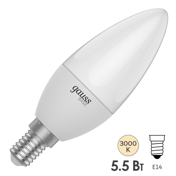 Светодиодная лампочка формы свеча Гаусс мощностью 5,5 Ватт, с цоколем E14 (миньон), теплый белый свет, матовая колба 1033116