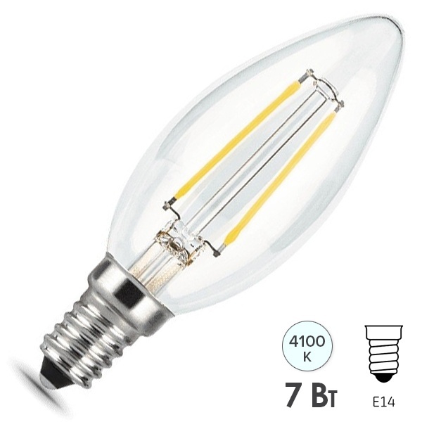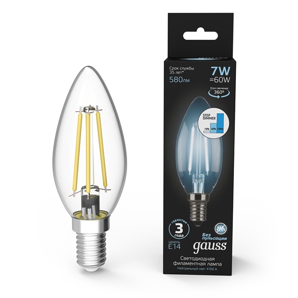 Филаментная лампочка свеча Гаусс с нитевидными светодиодами, со ступенчатой регулировкой яркости, мощностью 7 Ватт, с цоколем E14, нейтральный белый свет 103801207-S