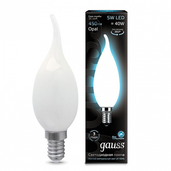 Филаментная лампочка формы свеча на ветру с нитевидными светодиодами, мощностью 5 Ватт, с цоколем E14, нейтральный белый свет, матовая колба 104201205