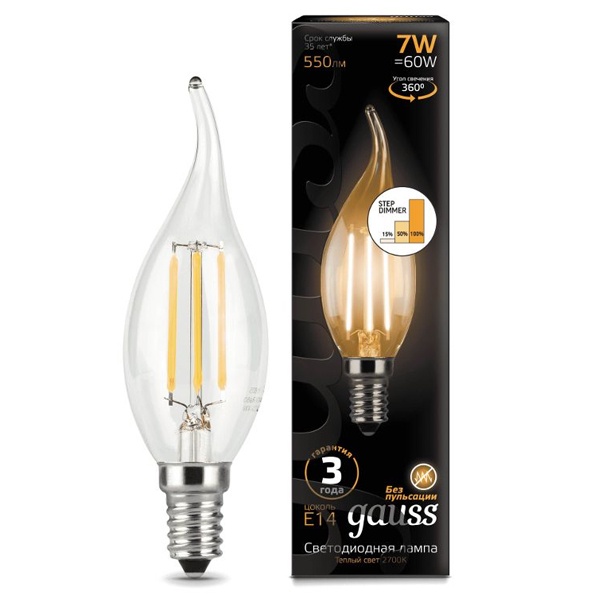 Филаментная лампочка свеча на ветру Гаусс с нитевидными светодиодами, со ступенчатой регулировкой яркости, мощностью 7 Ватт, с цоколем E14, тёплый свет 104801107-S