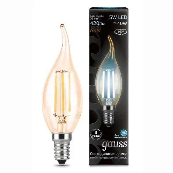 Филаментная свеча на ветру Гаусс, мощностью 5 Ватт, с цоколем E14, нейтральный белый свет, прозрачная колба 104801805