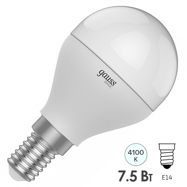 Светодиодная лампочка шарик Гаусс, мощностью 7,5 Ватт, с цоколем E14, нейтральный белый свет, матовая колба 1053128