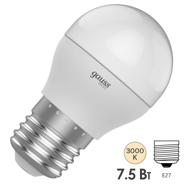 Светодиодная лампочка шарик Гаусс, мощностью 7,5 Ватт, с цоколем E27, теплый белый свет, матовая колба 1053218