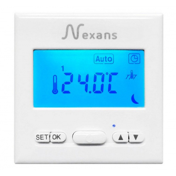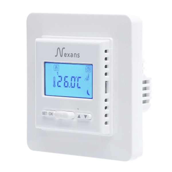 Термостат Nexans N-COMFORT TD - это удобный для пользователя 7-дневный программируемый терморегулятор для регулирования температуры в помещениях с электрическим подогревом. В данном терморегулятора есть два датчика: датчик температуры пола и встроенный датчик температуры воздуха. Датчик температуры пола также может быть использован для ограничения температуры в полу, пока комнатная температура контролируется встроенным датчиком (режим двойного датчика). Терморегулятор поставляется с рамками Elko Plus Polar White and Schneider Exxact White.