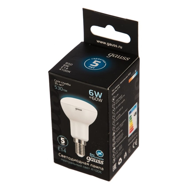 Лампа светодиодная Gauss LED R50 6W 4100K 220V E14 530Lm белый свет 106001206