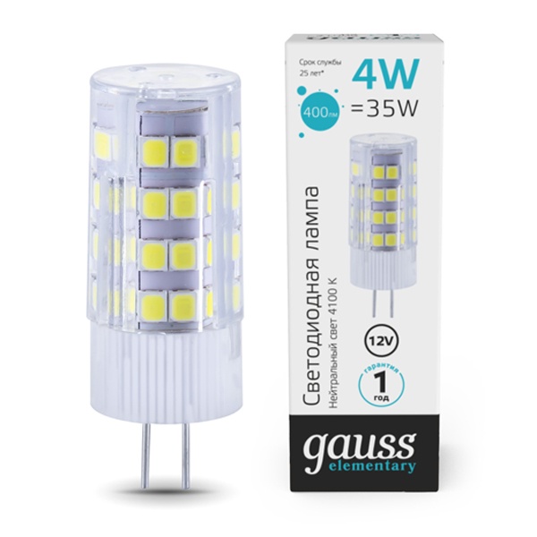 Лампа светодиодная Gauss Elementary 4W 4100K 12V G4 400Lm керамика LED 1/10/200 10724