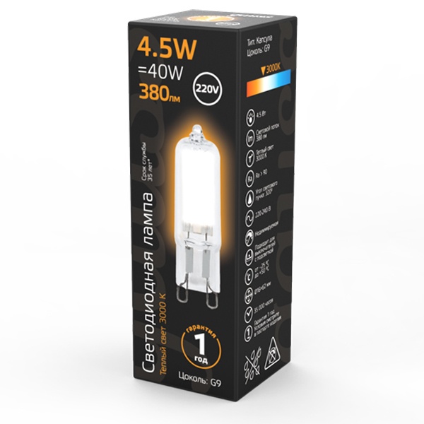 Светодиодная капсульная лампочка Гаусс, мощностью 4,5 Ватта, с цоколем G9, теплый белый свет, стеклянная колба 107809104