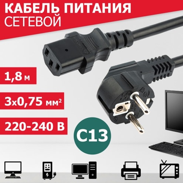 Шнур сетевой евро 0.75 мм2 1.8 м (PE) (с заземлением) REXANT предназначен для подключения к сети переменного тока с напряжением 220 B стационарных персональных компьютеров, мониторов, ИБП, принтеров и других периферийных устройств, имеющих штыревой разъем типа C14. Также шнур сетевой евро (IEC cord) используется для питания многих видов электроприборов, например, усилителей для электронных музыкальных инструментов и профессионального звукового оборудования. Данный шнур IEC оснащен с одной стороны неразборной литой вилкой (евростандарт) с заземляющим контактом, с другой — литым трехконтактным гнездовым разъемом C13 и трехжильным проводом с сечением жил 0.75 мм2.