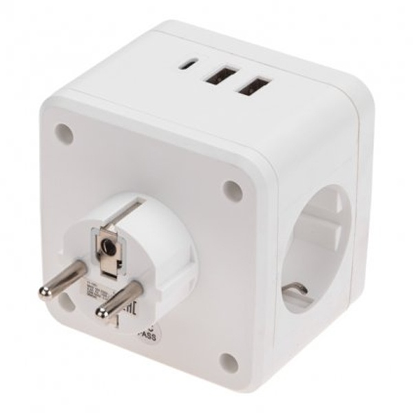 Электрический двойник в виде компактного куба с двумя розетками (2P+E) на 16 ампер предназначен для удобного подключения нескольких электроприборов одновременно. Особенностью устройства является наличие двух USB-A портов (с выходной мощностью до 2,4А) и одного порта USB Type-C (с мощностью до 3А), что позволяет напрямую заряжать мобильные устройства без необходимости использования адаптеров.