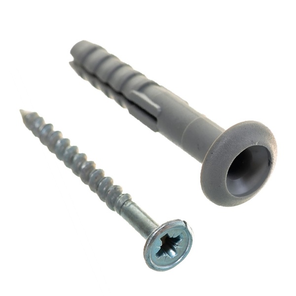 Полипропиленовый распорный дюбель для быстрого монтажа со стальным оцинкованным гвоздем-шурупом с увеличенным подголовником.