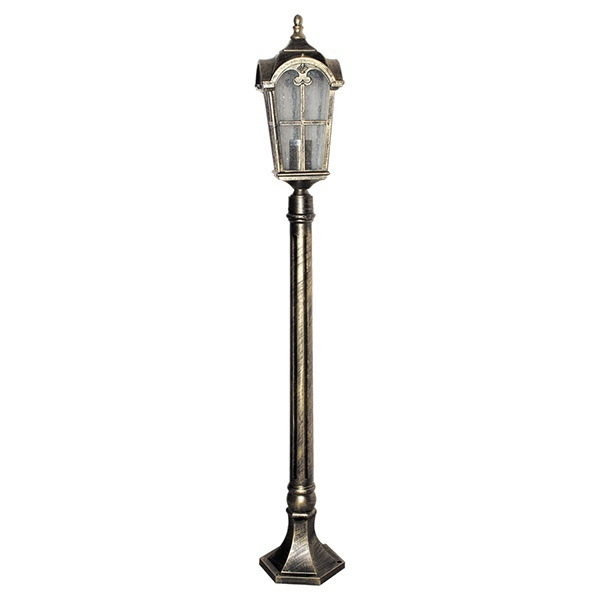 Светильник садово-парковый Замок PL107 E27 150*150*1120мм черное золото (столб 1,1м) предназначен для создания световой зоны на среднем и нижнем уровне. Конструкция, сборная: фонарь; опорный элемент (столб). Материал арматуры – прочный и стойкий к кислотно-щелочной коррозии алюминиевый сплав. Рассеиватель – кварцевое стекло. Монтажный вариант – анкерный крепеж платформы в основании столба на жесткую горизонтальную поверхность.