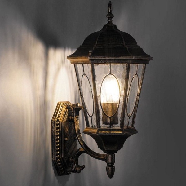 Светильник садово-парковый Витраж PL161 E27 200*250*425мм черное золото (малый на стену вниз) используется в качестве источника общего фонового освещения в помещениях с любым микроклиматом, а также в качестве фасадной подсветки парадных подъездов. Описание: Компактность конструкции светильника обеспечивается за счет короткой консольной дуги, удерживающей шестигранный фонарь. Консольное соединение – низ фонаря. Цвет основных элементов: арматура фонаря, консоль, монтажная платформа, - черное золото. Рассеиватель – стекло «битый лед».Дополнительная информацияПроизводитель – компания Feron (Китай).Габариты – 200х250х425 мм.Материал – сплав алюминия и кремния (силумин), прочный и устойчивый к воздействию атмосферной коррозии.Форма производства – литье.Комплектация – патрон резьбовой под цоколь лампы Е27.Расчетные токовые характеристики:- максимальная мощность нагрузки – 60 Ватт;- подключение – в общую энергосеть переменного тока;- номинальное сетевое напряжение – 220 Вольт;- рекомендованный производителем элемент света – лампа светодиодная.Коэффициент защиты от атмосферных воздействий – IP44.