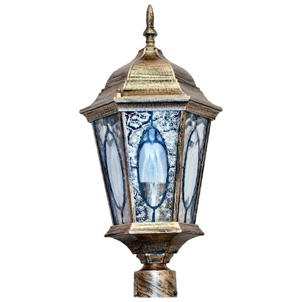 Светильник садово-парковый Витраж PL162 E27 205*175*440мм черное золото (малый на столб 0,41м) предназначен для установки на вертикальную опору, линейный размер которой определяет прикладное применение оборудования: общее фоновое освещение; акцентная подсветка.Описание: В основании фонаря светильника находится монтажная втулка, которая используется для установки светильника на столб. Общий цвет – черное золото. Рассеиватель фонаря – кварцевое стекло «битый лед».Дополнительная информацияПроизводитель – компания Feron (Китай).Габариты – 205х175х440 мм.Материал – сплав алюминия и кремния (силумин), прочный и стойкий к коррозии.Форма производства – литье.Комплектация – патрон резьбовой под цокольный контакт Е27.Электротехнические характеристики:- максимальная мощность нагрузки – 60 Ватт;- подключение – в общую энергосеть переменного тока;- номинальное сетевое напряжение – 220 Вольт;- элемент света, рекомендованный производителем – лампа светодиодная.Коэффициент защиты от атмосферных воздействий – IP44.