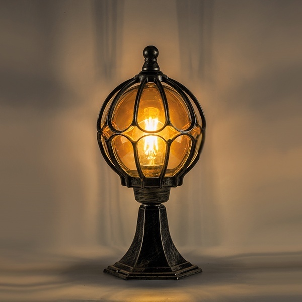 Уличный светильник «Сфера» серии PL3804 от производителя Ферон устанавливается на короткой ножке на заборные столбики и различные ограждения, перила больших лестниц, и переходных мостиков для освещения парковых дорожек, различных площадок, зон отдыха, подсветки бассейнов и различных ландшафтных композиций загородных домов. Корпус изготавливается из стойкого к неблагоприятным погодным условиям силумина и имеет степень защиты, относящуюся к классу IP44. Для освещения могут использоваться лампочки накаливания, а также энергосберегающие и светодиодные лампы. Фонарь круглой формы диаметром 220 мм.установлен на короткую ножку. Общая высота светильника, включая столб, составляет 460 мм. Дизайн выполнен в готическом стиле из силумина. Характеристики светильника Диаметр окружности фонарей – 220мм. Патрон под цоколь Е27. Номинальная мощность ламп – 60 Ватт. Номинальное напряжение сети для светильника – 230 ВольтЦвет фонаря – черное золото.