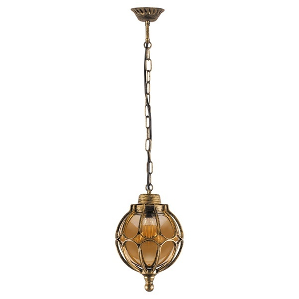 Светильник садово-парковый Сфера PL3805 E27 220*220*840мм черное золото (на цепочке) предназначен для освещения пространства и объемов, не защищенных от атмосферных воздействий. Каркас фонаря соединяется с монтажной платформой кольцевой цепочкой, образующей подвес. Светильник устанавливается на несущих конструкциях потолков летних беседок и в арочных проемах. В качестве фасадной подсветки – на любом архитектурном выступе здания.