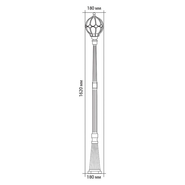Светильник состоит из одного плафона. Для работы требуется светодиодные либо энергосберегающие лампы с цоколем Е27. Фонарь закреплен на металлическом столбе, который устанавливается на бетонную основу.