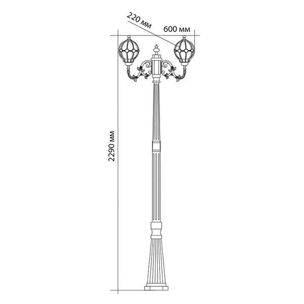Уличный садово-парковый светильник модели PL3808 «Сфера» состоит из декоративного столба, который устанавливается на бетонное основание. К его верхней стойке на фигурных консолях прикреплены два шарообразных фонаря. Для работы требуются светодиодные либо энергосберегающие лампы с цоколем Е27. В них же могут устанавливаться и обычные лампы накаливания. Фонари и столб имеют окраску под цвет «Черное золото». Шарообразный каркас фонаря изготавливается из алюминия либо силумина, отличается высокими пыле и влагозащитными свойствами имеет класс защиты IP44. Данный светильник предназначается для освещения парковых дорожек, различных площадок, зон отдыха, подсветки бассейнов и различных ландшафтных композиций загородных домов.Характеристики светильникаОбщая высота, включая столб – 2.29 м. Общая ширина – 600 мм. Диаметр окружности фонарей – 220мм. Патрон под цоколь Е27. Номинальная мощность ламп – 60 Ватт. Номинальное напряжение сети для светильника – 230 Вольт.