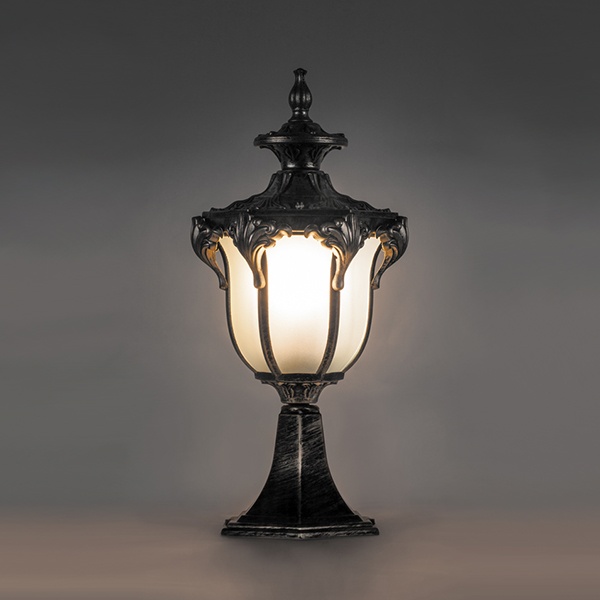Светильник садово-парковый, коллекции «Флоренция» PL4053 E27 устанавливается на короткой ножке для монтажа на постамент, и используется для декоративной подсветки террас, открытых веранд, беседок, в кафетериях, ресторанах, а так же для освещения входной группы домов. Корпус светильников устойчив к любому агрессивному воздействию атмосферной среды. Изготовлен из стеклянного плафона округлой формы из матового стекла, который вставлен в литой каркас из силумина. Обладает значительными защитными свойствами от влаги и пыли IP44 степени. Источниками света служат светодиодные, а также энергосберегающие лампы, имеющие цоколь E27. Краткие характеристики Мощность источников света – 60 Ватт. Сетевое напряжение для подключения светильника – 230 Вольт. Патрон под цоколь E27. Модель - PL4053 E27. Габаритные размеры – 215х245х520 мм.Материал корпуса - силумин.Плафон – матовое стекло.Цвет светильника – черное золото. Производитель – Ферон. Серия – Флоренция.