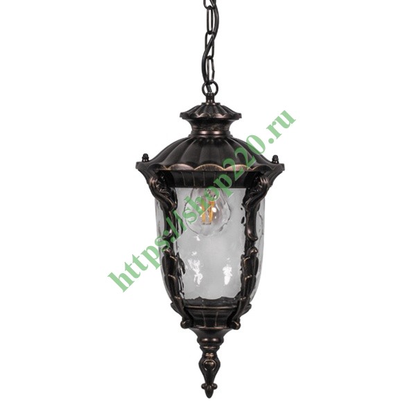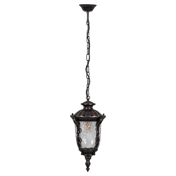 Для освещения необходимо использовать светодиодные, энергосберегающие, а также лампы накаливания с цоколем Е27. Сам фонарь, включая цепь, покрашен в цвет темно-коричневого золота.