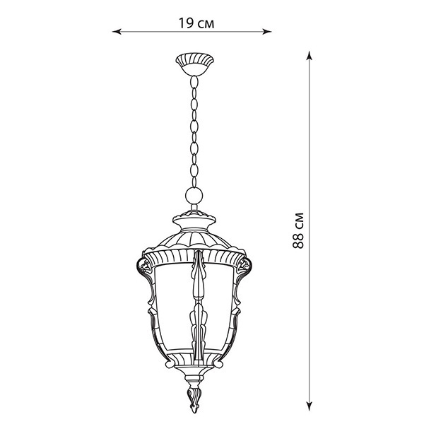 Корпус фонаря изготовлен из силумина, с плафоном округлой формы из матового стекла в середине. Подвешивается на металлическую цепь длиной 500 мм, обеспечен защитой от пыли и влаги системой класса IP44. Фонарь устойчив против агрессивных воздействий и температурных изменения атмосферы.