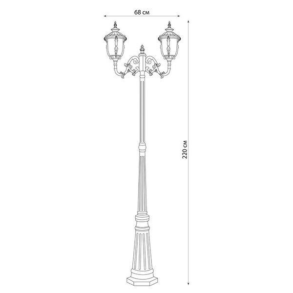 Описание: Сборная конструкция состоит из двух основных элементов – консольного блока с двумя фонарями и вертикальной опоры. Цилиндрические плафоны фонарей выполнены из прозрачного кварцевого стекла. Цвет основных элементов – золото (темно-коричневое).