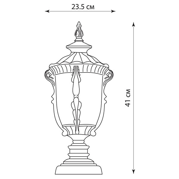 Описание: На многоступенчатом основании располагается арматурный каркас фонаря с цилиндрическим плафоном из рифленого кварцевого стекла. Верхняя часть светильника представляет собой ажурный купол. Цвет – золото (темно-коричневое).